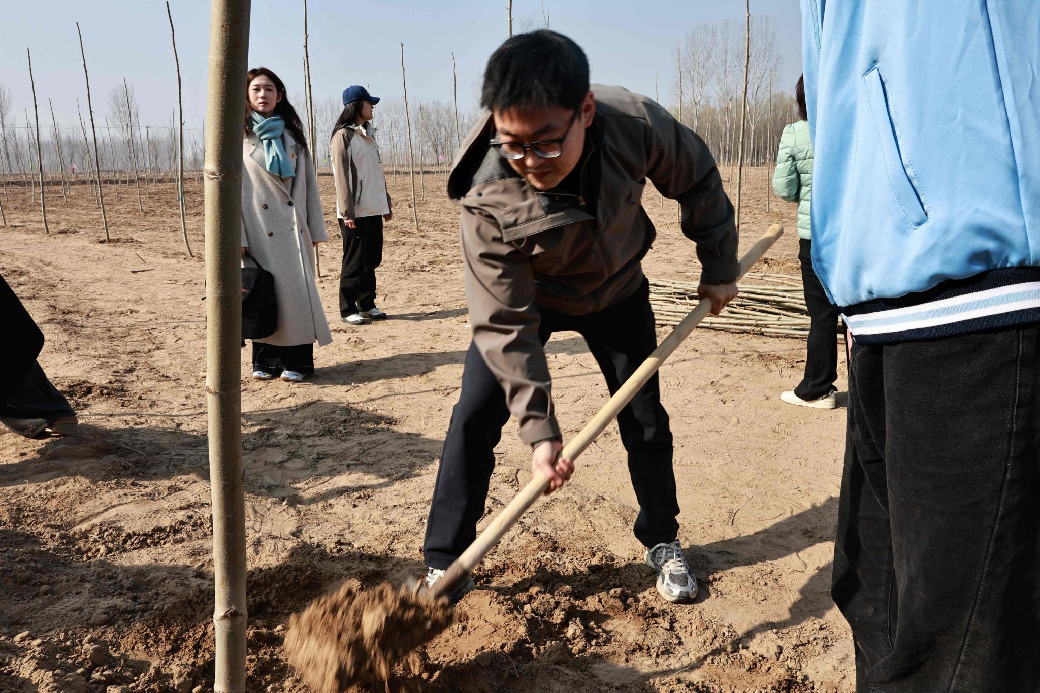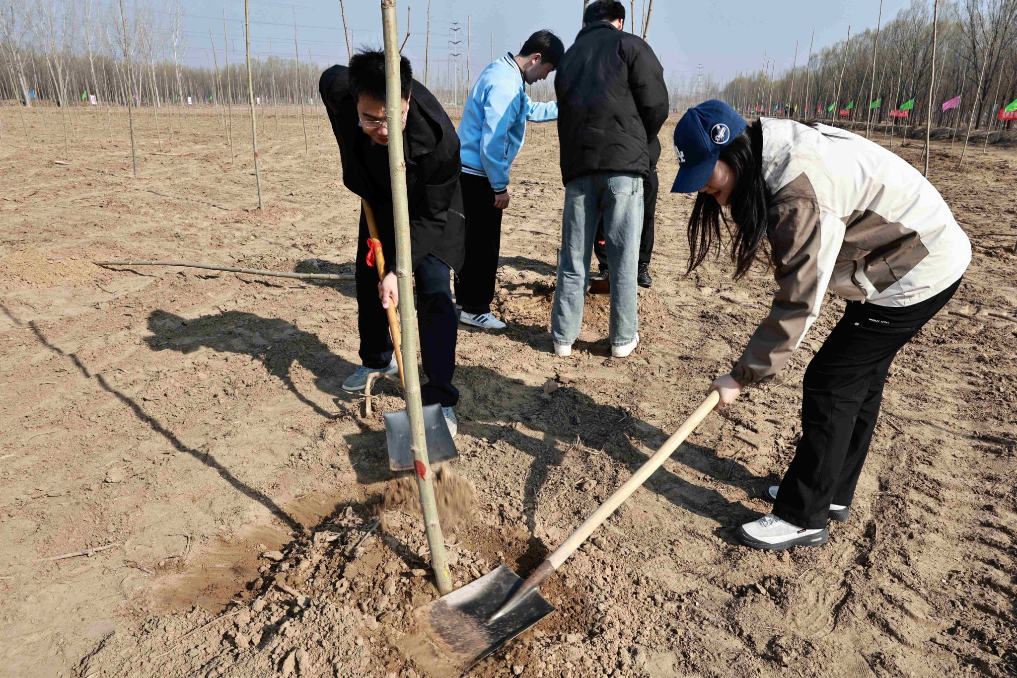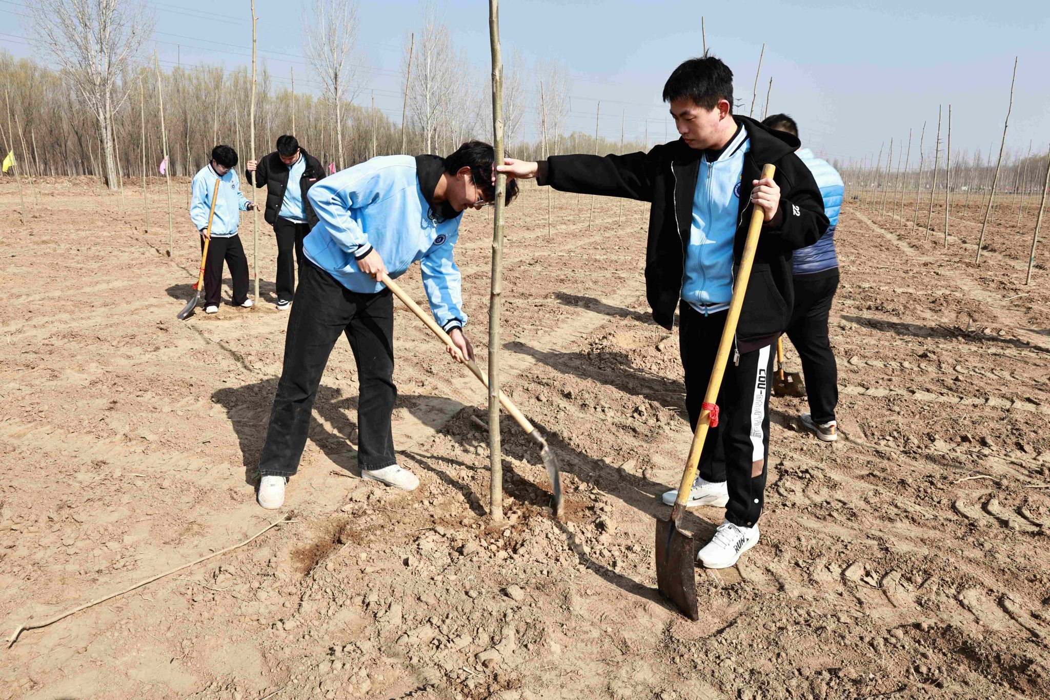 活动现场,学院师生热情高涨,大家三五成组,挥锹铲土、扶苗围堰、提水浇灌,干劲十足。经过一上午的辛勤劳作,一株株新栽种的树苗在黄河岸边“安家落户”,错落有致、迎风挺立,为初春增添了勃勃生机。